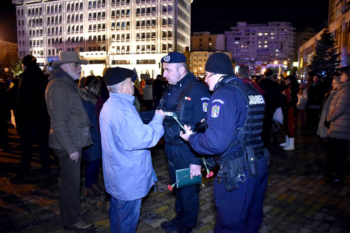 Şi de această dată la Piteşti fost o manifestaţie paşnică, iar protestatarii le-au împărţit flori jandarmilor.