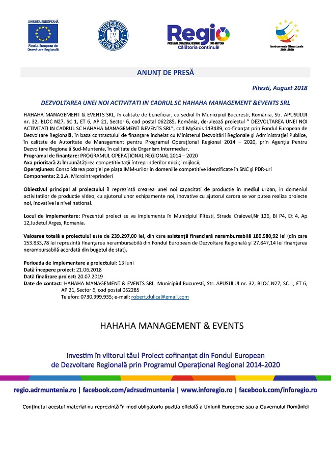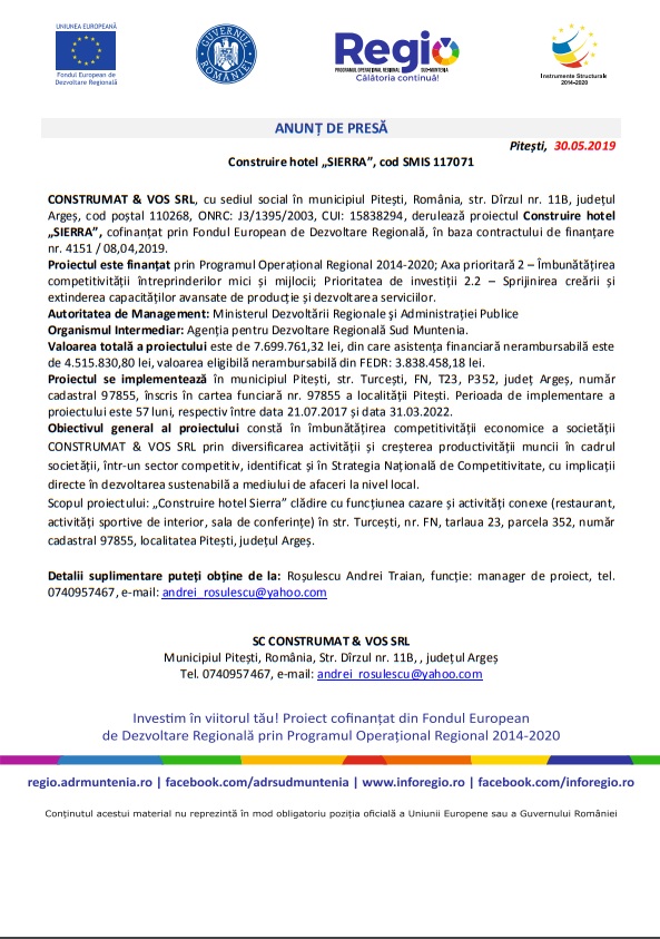 Advertisement Fundația ARI, având sediul în municipiul Pitești, str. Carpați, nr. 2, bl. C4, sc. F, et. 1, ap. 5, județul Argeș, titular al planului/p... Read more