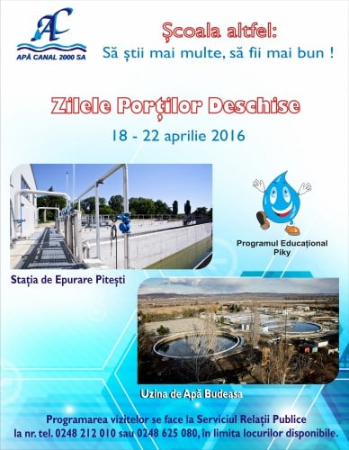 Societatea Apă Canal 2000 SA Piteşti vine în întâmpinarea instituţiilor de învăţământ care derulează programul educaţional „Şcoala altfel – Să ştii mai multe, să fii mai bun!”, prin deschiderea porţilor Uzinei de Apă Budeasa şi Staţiei de Epurare Piteşti în perioada 18-22 aprilie.