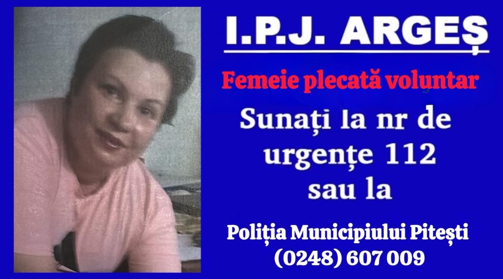 La data de 26.03.2026, polițiștii din cadrul Secției 2 Poliție Pitești au fost sesizați de către o femeie cu privire la faptul că fiica sa, GHEORGHE COSTIANA AURORA, în vârstă de 43 de ani, a părăsit în mod voluntar adresa la care locuia din municipiul Pitești.