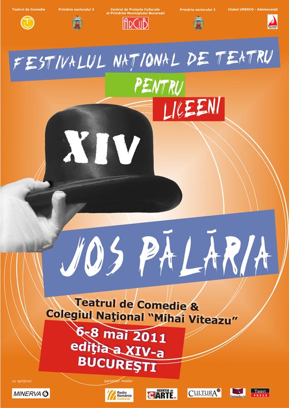 Festivalul Naţional de Teatru „Jos pălăria” se desfăşoară în perioada 6-8 mai 2016 la Colegiul Naţional „Mihai Viteazul” Bucureşti, ediţia a 19-a. La deschiderea oficială, invitat de onoare este actorul Mihai Bendeac.