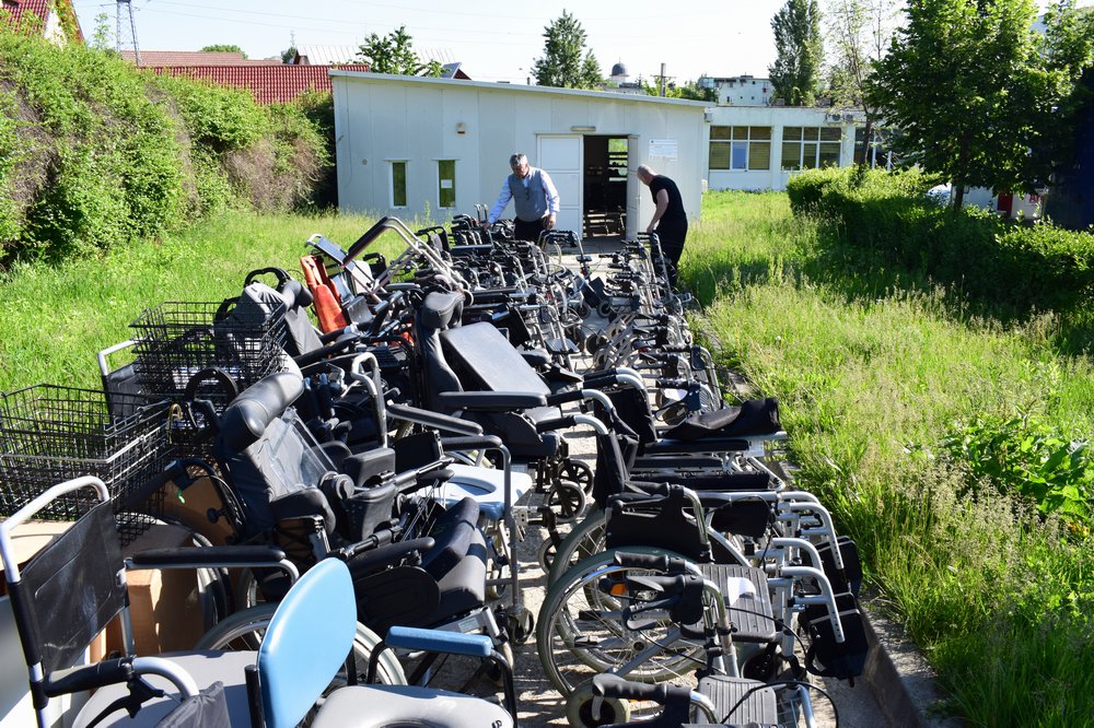 Din autocaminul tras în parcarea din faţa atelierului de reparaţii al asociaţiei, au fost descărcate o mulţime de fotolii rulante fixe şi pliabile, cadre de mers fixe şi mobile, căruţ special adaptat pentru nou-născuţi, toalete speciale, toalete speciale mobile pentru persoanele imobilizate la pat, noptieră tip spital, un fapt metalic etc.