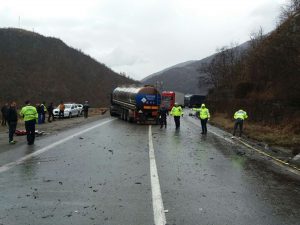 Evenimentul a avut loc ieri-dimineaţă la Drăganu, unde Nedelcov I., de 41 de ani, cetăţean bulgar, circula cu un Citroen dinspre Vâlcea către Argeş. Ajuns la Drăganu, cu doar 15 km înainte de a ajunge la Piteşti, şoferul s-a angajat în depăşirea unui tir, la volanul căruia se afla Ioan B., în vârstă de 37 de ani, din Sibiu. Din cauză că nu s-a asigurat, cel în cauză s-a tamponat frontal cu o autocisternă condusă regulamentar din sens opus de Petru Andrei S., de 30 de ani, din Cristioru de Jos, judeţul Bihor. În urma impactului, Citroenul a ricoşat în tirul pe care a încercat să-l depăşească. La locul evenimentului a intervenit o ambulanţă SMURD de prim ajutor calificat, care l-a preluat pe şoferul bulgar şi transportat la spital. Medicii au stabilit că bărbatul avusese mare noroc şi a scăpat doar cu leziuni uşoare (contuzii şi escoriaţii), iar în cauză a fost deschis dosar penal pentru vătămare corporală din culpă. Pe parcursul cercetărilor traficul a fost restricţionat aproape o oră, timp în care circulaţia s-a derulat alternativ pe un singur fir.