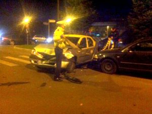 Puţin după ora 19 a serii de duminică, Florin D., de 49 de ani, din Piteşti, circula cu un Peugeot 206 pe strada Crinului. Ajuns la intersecţia cu strada Gheorghe Şincai, din cauză că nu a acordat prioritate de trecere, s-a tamponat cu o Dacia Logan taxi condusă regulamentar dinspre Calea Bucureşti către Târgu din Vale de Bogdan V., de 19 ani, din Ştefăneşti. Din impact, taxiul a fost aruncat într-un alt Logan, acesta din urmă a ajuns într-un VW Passat, iar Passat-ul a fost împins la rândul rău într-un Fiat, ultimele trei autoturisme fiind parcate în locuri special amenajate. Accidentul s-a soldat cu rănirea uşoară a taximetristului şi a clientului pe care-l avea în maşină, Narcis I., de 20 de ani, din Ştefăneşti. După ce au primit asistenţă din partea unei ambulanţe SMURD de prim ajutor calificat, cei doi au refuzat transportul la spital, iar în cauză a fost deschis dosar penal pentru vătămare corporală din culpă.