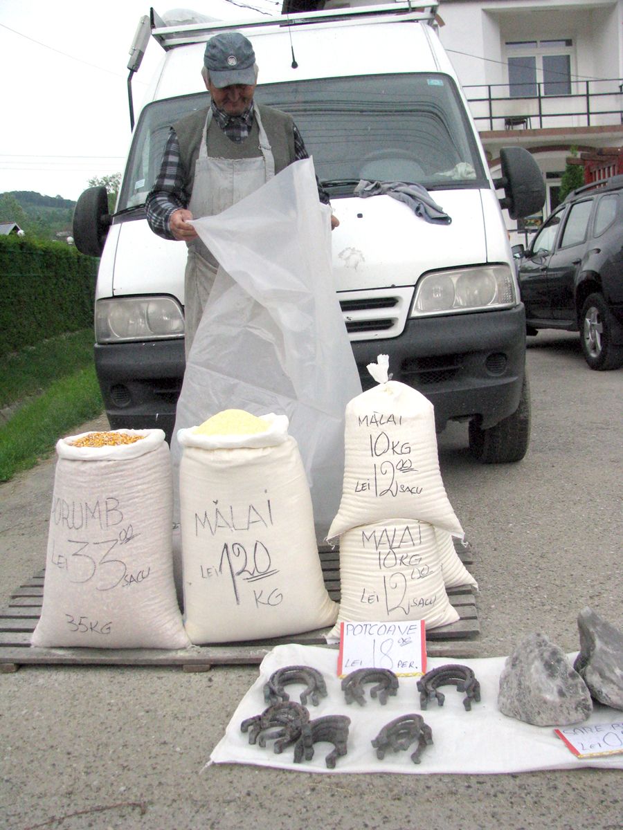 Cu şorţul de gât, un mic întreprinzător – pesemne morar – comercializează sacul cu poabe de porumb cu 33 lei (cântăreşte 35 kg) şi sacul de mălai cu 12 lei (10 kg). Pentru cei care pun de-o mămăligă, făina de cucuruz se vinde şi la kil, cu 1,20 lei. Precupeţul şi-a amenajat standul pe un şir de uluci desprinse dintr-un gard de lemn. Separat, pe un sac de rafie a pus şi alte mărfuri cu trecere la gospodarii din mediul rural: bulgări de sare (0,80 lei/kg) şi potcoave de cai (18 lei perechea).