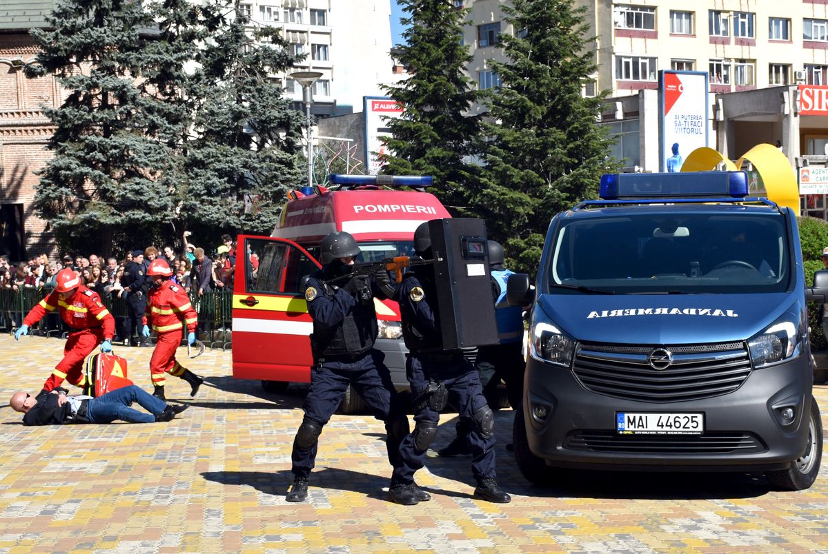 De departe, cel mai aplaudat şi spectaculos exerciţiu, când în Piaţa „Vasile Milea” au răsunat bubuituri de grenade şi focuri de arme, a fost prezentat de mascaţii jandarmi. În faţa Prefecturii Argeş a sosit o primă maşină, cea de escortă, din care au coborât efectivele care asigură însoţirea unui înalt oficial, realizând dispozitivul de protecţie. Cu cea de a doua maşină a sosit oficialul, care a coborât în momentul când comandantul gărzii de corp a fost informat de agenţi şi de lunetiştii instalaţi pe blocuri că zona e sigură. În momentul când înaltul oficial se deplasa către mulţimea care-l aştepta, un individ aruncă spre el cu o grenadă. Atunci gărzile anunţă cu voce tare despre ce pericol este vorba, după care deschid focul pentru neutralizarea atacatorului şi îl evacuează pe oficial. Un al doilea atacator a deschis focul chiar din clădirea prefecturii şi răneşte un component al grupului de protecţie. Este solicitată grupa de intervenţie aflată în zonă pentru a asigura evacuarea celui protejat, precum şi pentru a-l proteja pe militarul rănit până la sosirea echipajului SMURD.