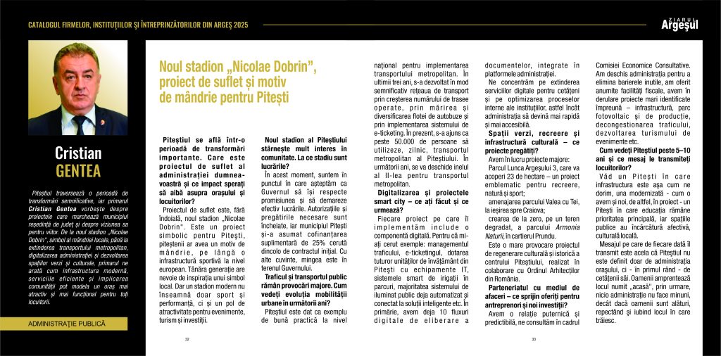Piteștiul traversează o perioadă de transformări semnificative, iar primarul Cristian Gentea vorbește despre proiectele care marchează municipiul reședință de județ și despre viziunea sa pentru viitor. De la noul stadion „Nicolae Dobrin”, simbol al mândriei locale, până la extinderea transportului metropolitan, digitalizarea administrației și dezvoltarea spațiilor verzi și culturale, primarul ne arată cum infrastructura modernă, serviciile eficiente și implicarea comunității pot modela un oraș mai atractiv și mai funcțional pentru toți locuitorii.
