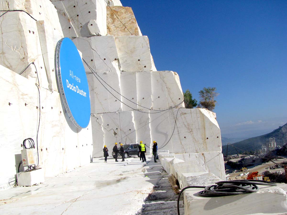 Un mic dejun frugal a fost suficient şi am plecat din nou la drum. De data asta la volanul unui Duster dCi cu transmisie automată EDC. Traseul, de 75 km, a fost în mare parte similar celui de la sosire, adică tot drumuri în majoritate neasfaltate, bălţi, dealuri, stânci, livezi, terenuri desfundate etc. Nu mi-a trebuit mult ca să constat că şi această versiune de motorizare face faţă solicitărilor, inclusiv plecări de pe loc în pante accentuate pe teren suficient de alunecos. După vreo oră şi ceva am ajuns la carierele Dionysos. Imaginea era de-a dreptul impresionantă: un munte de un alb orbitor în bătaia soarelui de unde se extrage marmură de ce mai bună calitate. Fiind o zonă deosebit de periculoasă, cu pereţi verticali, personalul de securitate a delimitat zonele de acces interzicând orice apropiere de abrupt şi fiecăruia dintre noi i-a fost înmânată o cască de protecţie, a cărei purtare era obligatorie pe tot parcursul vizitei.
