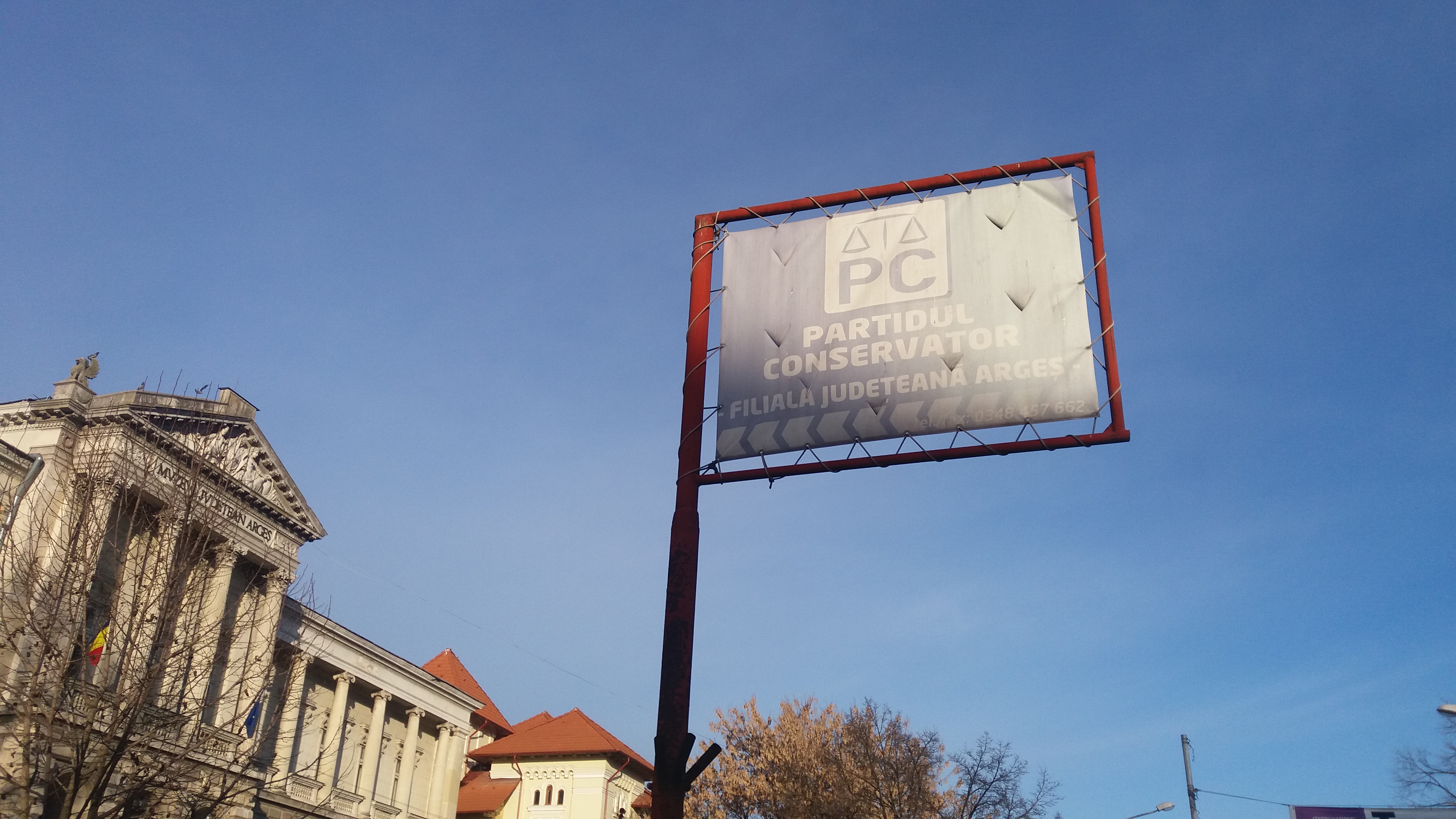 Pe un fond albastru-azur, numai bun să îţi aducă aminte de o vacanţă de vară la mare, lângă staţia de autobuz de la Muzeu se află, la înălţime, un panou cu însemnele PC. Numele şi balanţa caracteristice partidului fondat de către Dan Voiculescu încă mai sunt vizibile, deşi cam spălăcite din cauza vremii şi vremurilor. Acestea arată faptul că prin apropiere ar fi sediul organizaţiei judeţene de partid. Problema este că PC nu mai există: acesta a fuzionat cu PLR-ul lui Călin Popescu Tăriceanu şi a rezultat ALDE care în Argeş este condus de Simona Brătulescu şi Aurel Iacşa. Între timp, şi impozantul sediu de pe strada Armand Călinescu a fost pierdut. ALDE nu şi-a mai permis chiria şi utilităţile de mii de euro, aşa că s-a mutat în vechiul sediu (mic) din spatele Muzeului Judeţean…