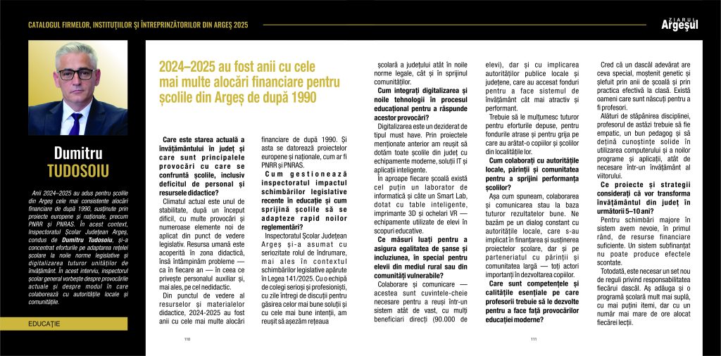 Anii 2024–2025 au adus pentru școlile din Argeș cele mai consistente alocări financiare de după 1990, susținute prin proiecte europene și naționale, precum PNRR și PNRAS. În acest context, Inspectoratul Școlar Județean Argeș, condus de Dumitru Tudosoiu, și-a concentrat eforturile pe adaptarea rețelei școlare la noile norme legislative și digitalizarea tuturor unităților de învățământ. În acest interviu, inspectorul școlar general vorbește despre provocările actuale și despre modul în care colaborează cu autoritățile locale și comunitățile.
