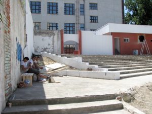 Se lucrează haotic, fără un plan stabilit înainte. Până acum s-a muncit ca în… filmele cu Stan şi Bran. În prima zi de şantier a fost zugrăvit corpul de clădire de la intrarea în amfiteatru, iar a doua zi a fost spart zidul proaspăt vopsit. Care zid, azi-mâine, va trebui iar vopsit. Din zori şi până-n seară, construim o ţară, cum ar zice maestrul Rebengiuc. Păcat că o construim în stil Dorel.
