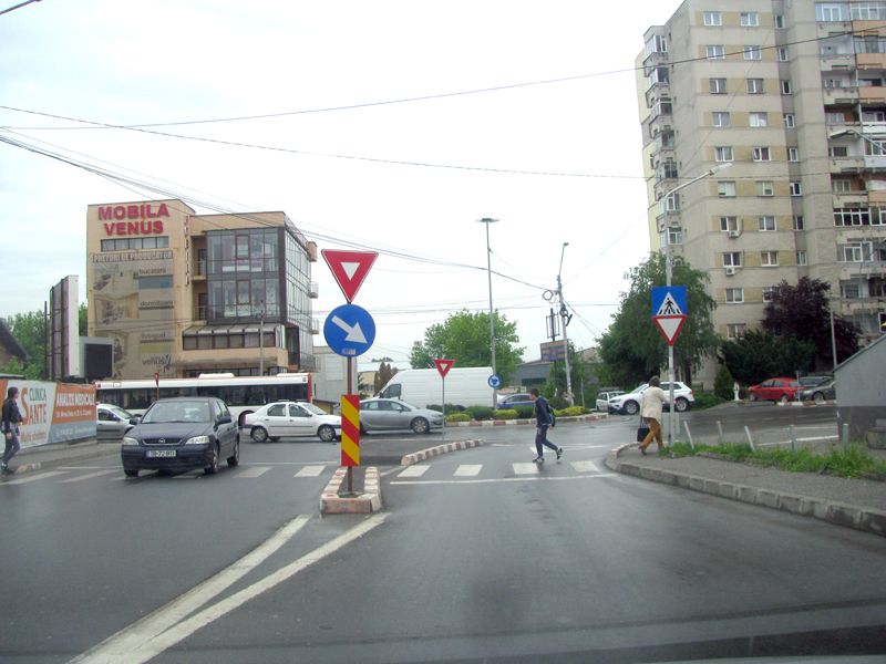 Problema este că, spre marea nemulţumire a conducătorilor auto, unele treceri de pietoni au fost amenajate şi unde nu trebuie. Este vorba despre zebrele de la sensurile giratorii, care în opinia participanţilor la traficul rutier au fost greşit amplasate. La o simplă evaluare pe teren am constatat că oamenii au dreptate. Marcajele pietonale se află chiar la colţul străzii sau în cel mai bun caz la doar câţiva metri distanţă de centrul sensului giratoriu. Aşa se face că, mai ales la orele de vârf, în momentul când unul sau mai mulţi pietoni se angajează în traversare, şoferii opresc pentru a le acorda prioritate. În această situaţie nicio maşină nu mai poate trece şi intersecţia este blocată. Imediat începe un vacarm de claxoane, se aud înjurături, se încearcă forţarea intersecţiei, strigă unii la alţii aruncându-şi tot felul de epitete, pietonii – inclusiv persoanele în vârstă, cu probleme de deplasare sau mame cu copii în cărucior – sunt ocărâţi ca pe maidan. Circ în toată regula, ce mai la deal, la vale.
