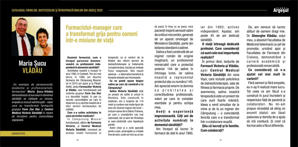 În primul rând, lanțurile de Farmacii Victoria și Vlădău, apoi Centrul Medical Victoria Sănătății din zona Vișoi, care include policlinica de balneofizioterapie, sala de fitness și farmacia proprie. De asemenea, salina noastră terapeutică este un proiect de care sunt foarte mândră. Ideea a venit simultan de la mine și de la un inginer din Câmpulung – o coincidență fericită care s-a transformat într-o colaborare reușită.
