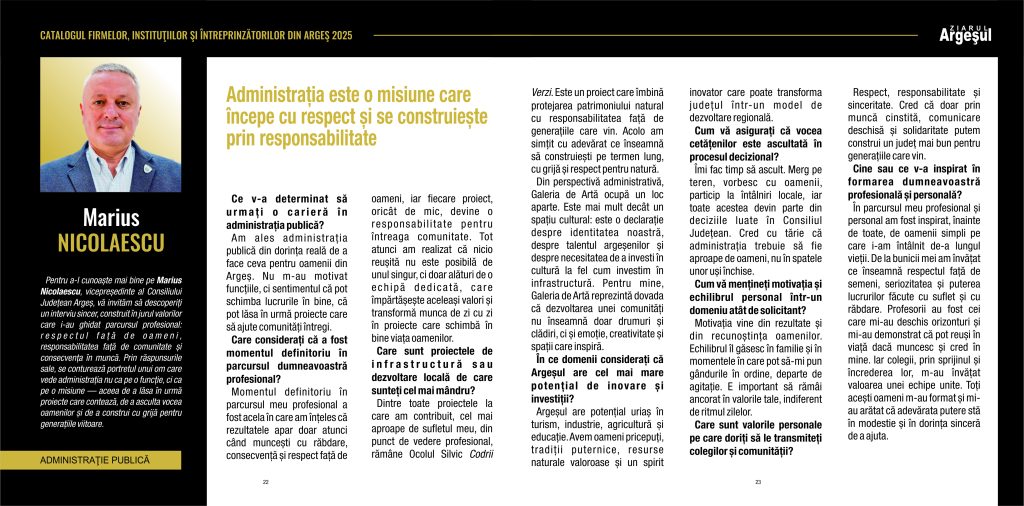 Pentru a-l cunoaște mai bine pe Marius Nicolaescu, vicepreședinte al Consiliului Județean Argeș, vă invităm să descoperiți un interviu sincer, construit în jurul valorilor care i-au ghidat parcursul profesional: respectul față de oameni, responsabilitatea față de comunitate și consecvența în muncă. Prin răspunsurile sale, se conturează portretul unui om care vede administrația nu ca pe o funcție, ci ca pe o misiune — aceea de a lăsa în urmă proiecte care contează, de a asculta vocea oamenilor și de a construi cu grijă pentru generațiile viitoare.