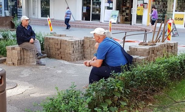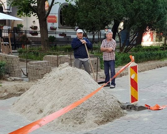 După atâtea discuţii grele şi osteneală de la sprijinit lopata, muncitorii iau o binemeritată pauză şi se aşază pe pavelele descărcate din remorcă în urmă cu o săptămână. Se face ora 10, echipa e în efectiv incomplet, iar Dorel aşteaptă întăriri. E o vorbă din bătrâni cum că îţi merge rău toată săptămâna dacă o iei cu munca înaintea colegilor şi să-i faci să te invidieze. Uite aşa mai trece un ceas, iar soarele ajunge sus pe cer şi pripeşte de îţi vine să te arunci îmbrăcat în gârlă. Ei bine, tocmai atunci se pun oamenii noştri pe treabă, ca să transpire şi să dea bine la public.