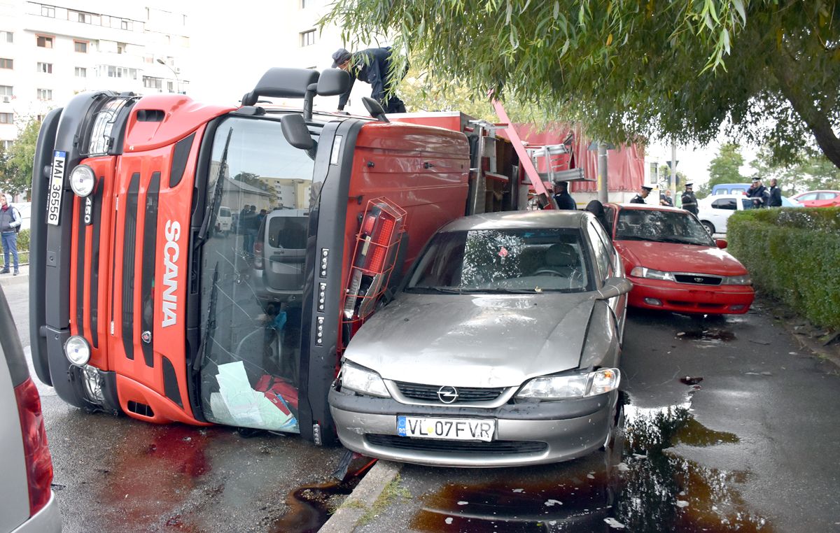 În jurul orei 7.45, pompierii piteşteni au fost solicitaţi să intervină la un incendiu izbucnit în cartierul Războieni, iar spre locul evenimentului au pornit două autospeciale cu apă şi spumă. Pe timpul deplasării, pe o stradă cu sens unic, una dintre maşinile de stingere, în care se aflau patru subofiţeri, a intrat în balans şi nu a mai putut fi controlată. Aşa se face că autospeciala s-a înclinat periculos de mult şi în final s-a răsturnat. Lucrurile nu s-au oprit doar la atât, fiindcă în timp ce aluneca pe asfalt, maşina pompierilor a avariat grav trei autoturisme, un Opel, un Cielo şi o Dacia Logan, parcate în faţa unui bloc. Din fericire, niciun om nu trecea prin zonă la ora aceea, nu s-au înregistrat victime şi nici subofiţerii din echipaj nu au suferit răni grave. În acest context, pentru stingerea incendiului a fost alocată o altă autospecială.