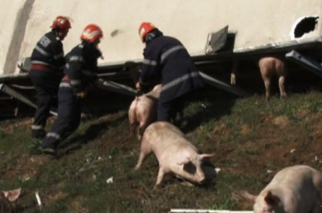 La locul incidentului a sosit şi patronul firmei la care trebuia să ajungă porcii, însoţi de mai mulţi angajaţi. Mai bine de şase ore s-au chinuit pompierii, poliţiştii şi muncitorii să scoata animalele de acolo, însă până la urmă s-a renunţat pentru că tirul se afla într-o poziţie greu de abordat şi se lăsase întunericul. Cei circa 200 de porci au rămas peste noapte în vehiculul răsturnat, iar operţiunea de recuperare a animalelor, unele dintre ele murind strivite, şi repunere a tirului pe roţi fiind reluată în această dimineaţă.