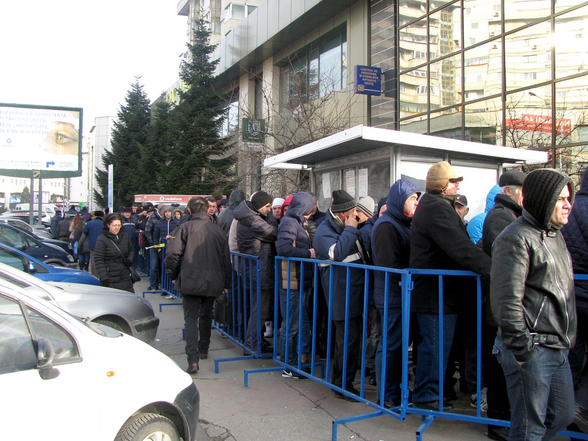 Astăzi, în prima zi fără timbrul de mediu, sute de persoane s-au adunat din nou la Serviciul Public Regim Pemise de Conducere şi Înmatriculări Vehicule Argeş. Nerăbdători şi, în acelaşi timp, cu teamă că minunea nu va ţine mai mult de câteva zile, oamenii au dat buzna să îşi înmatriculeze autovehiculele. Şi nu vorbim despre înmatriculări provizorii, ci de cele definitive, mai ales ale vehiculelor care circulau cu numere de Bulgaria, Italia, Franţa, Austria, Germania, Olanda şi alte state. Bănuind că vor fi şi alţii ca ei, s-au strâns în faţa Înmatriculărilor încă de pe la orele trei-patru ale dimineţii şi au aşteptat în frig la rând. Când s-a luminat de ziuă, coada se întindea până în faţa Sucursalei CEC, iar argeşenii continuau să vină.