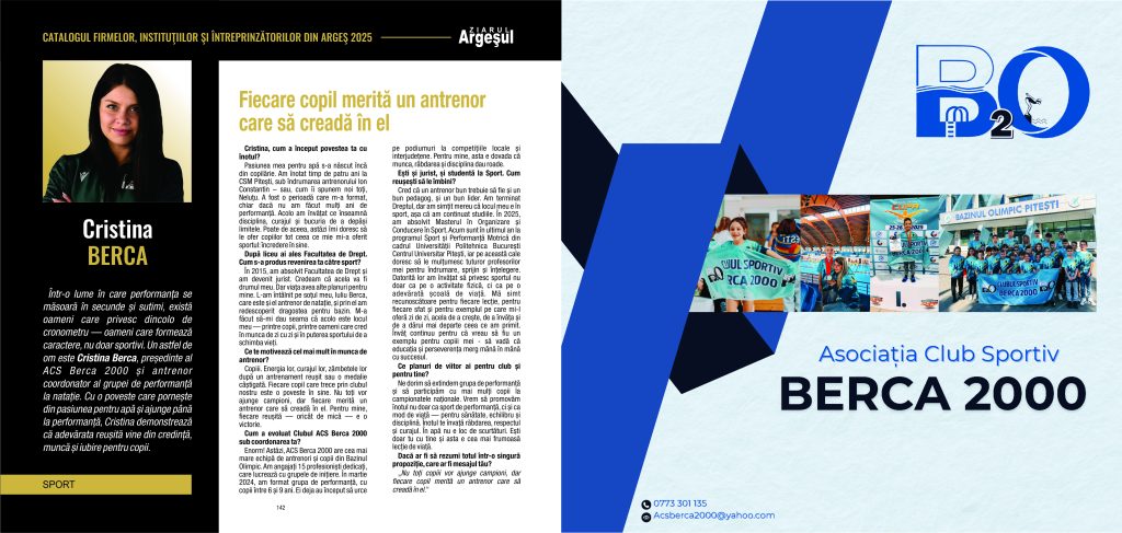 Într-o lume în care performanța se măsoară în secunde și sutimi, există oameni care privesc dincolo de cronometru — oameni care formează caractere, nu doar sportivi. Un astfel de om este Cristina Berca, președinte al ACS Berca 2000 și antrenor coordonator al grupei de performanță la natație. Cu o poveste care pornește din pasiunea pentru apă și ajunge până la performanță, Cristina demonstrează că adevărata reușită vine din credință, muncă și iubire pentru copii.