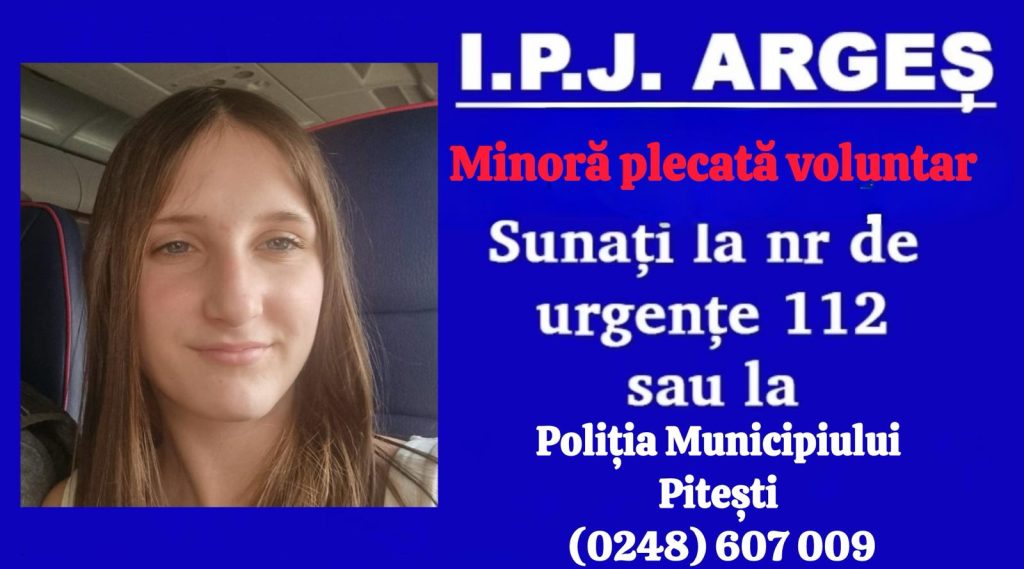 Astăzi, 01 ianuarie 2026, în jurul orei 13:00, la sediul Secției nr. 1 Poliție Pitești s-a prezentat o femeie din municipiul Pitești, care a sesizat faptul că fiica sa minoră a plecat voluntar și nu a mai revenit la domiciliu.