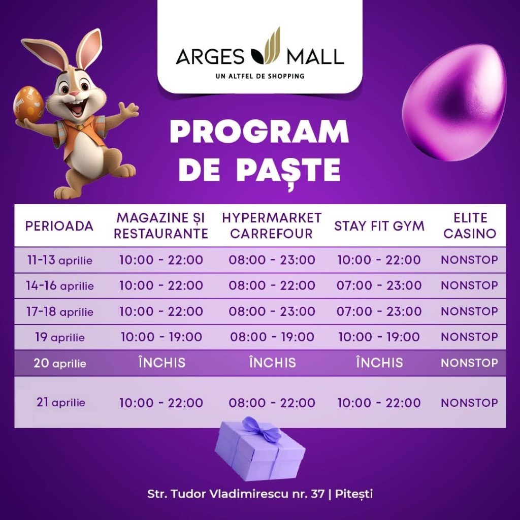 Argeș Mall își adaptează programul în perioada sărbătorilor pascale pentru a le oferi vizitatorilor posibilitatea de a-și face cumpărăturile la timp.