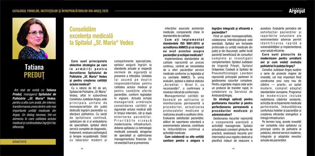 Am stat de vorbă cu Tatiana Preduț, managerul Spitalului de Psihiatrie „Sf. Maria” Vedea, pentru a afla cum arată, din interior, transformarea uneia dintre cele mai importante unități medicale din Argeș. Un dialog necesar, într-un domeniu în care calitatea actului medical și continuitatea îngrijirii fac diferența.