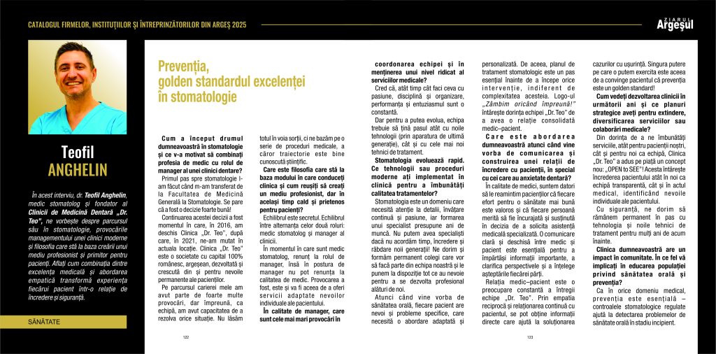 În acest interviu, dr. Teofil Anghelin, medic stomatolog și fondator al Clinicii de Medicină Dentară „Dr. Teo”, ne vorbește despre parcursul său în stomatologie, provocările managementului unei clinici moderne și filosofia care stă la baza creării unui mediu profesionist și primitor pentru pacienți. Aflați cum combinația dintre excelența medicală și abordarea empatică transformă experiența fiecărui pacient într-o relație de încredere și siguranță.