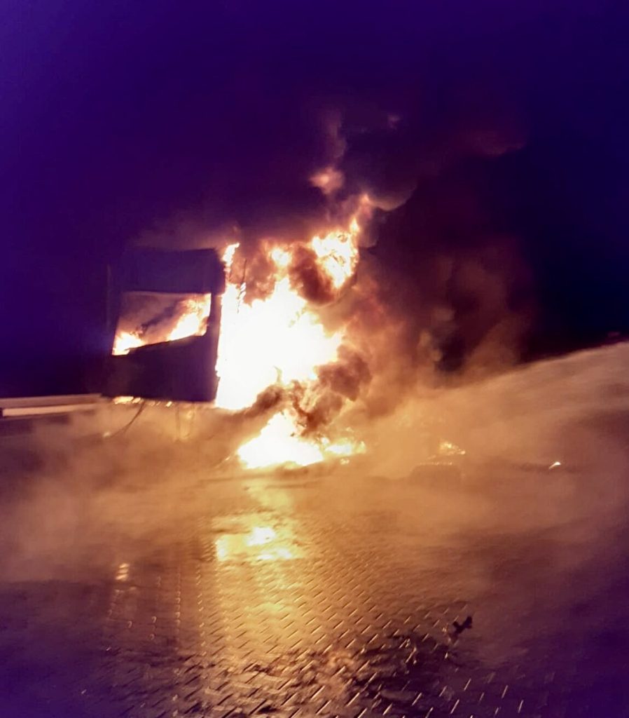 Incendiul a fost stins, însă capul tractor a fost distrus în totalitate. Conform ISU Sibiu, focul a izbucnit ca urmare a unui scurtcircuit electric produs la compartimentul motor.