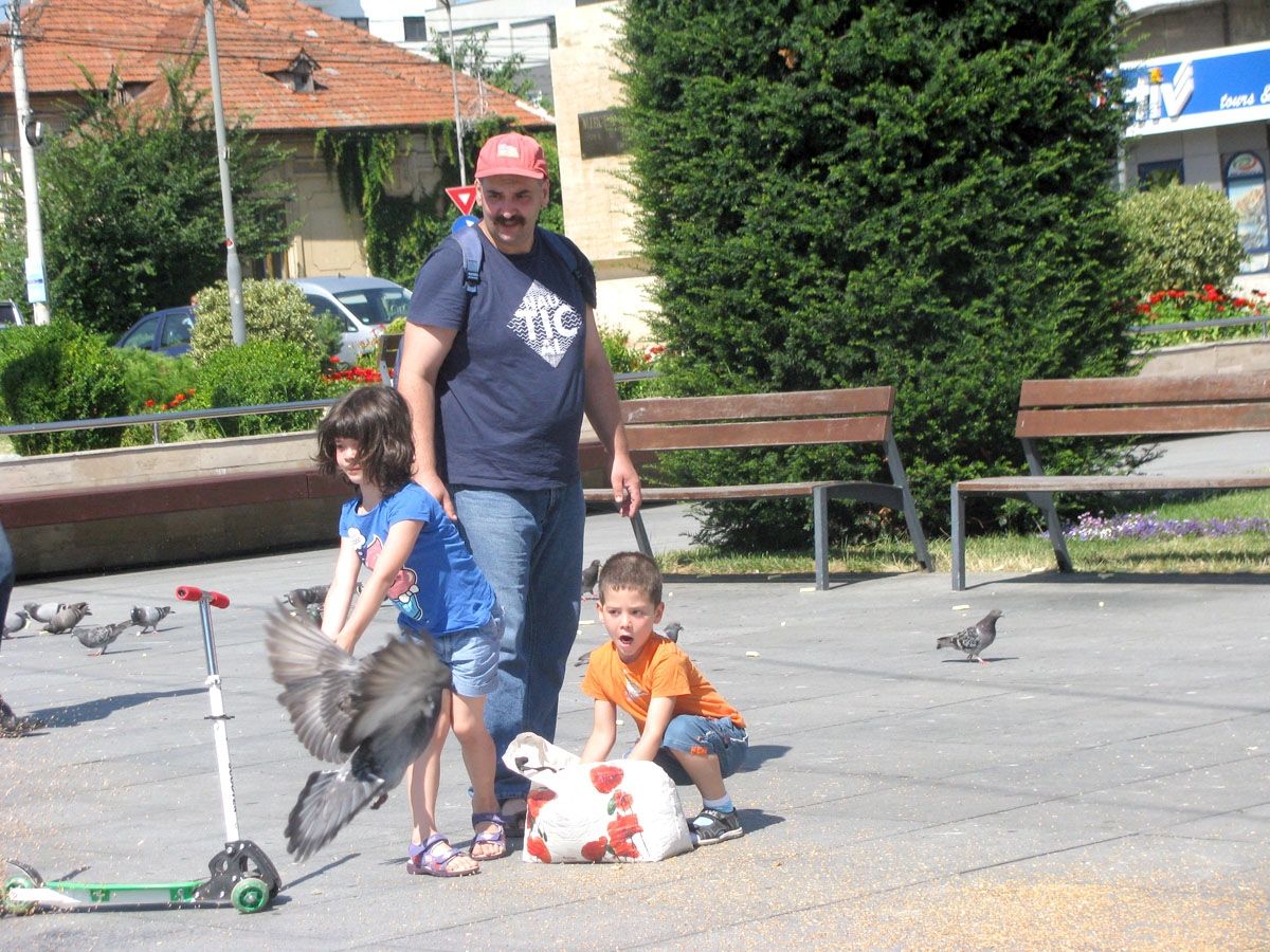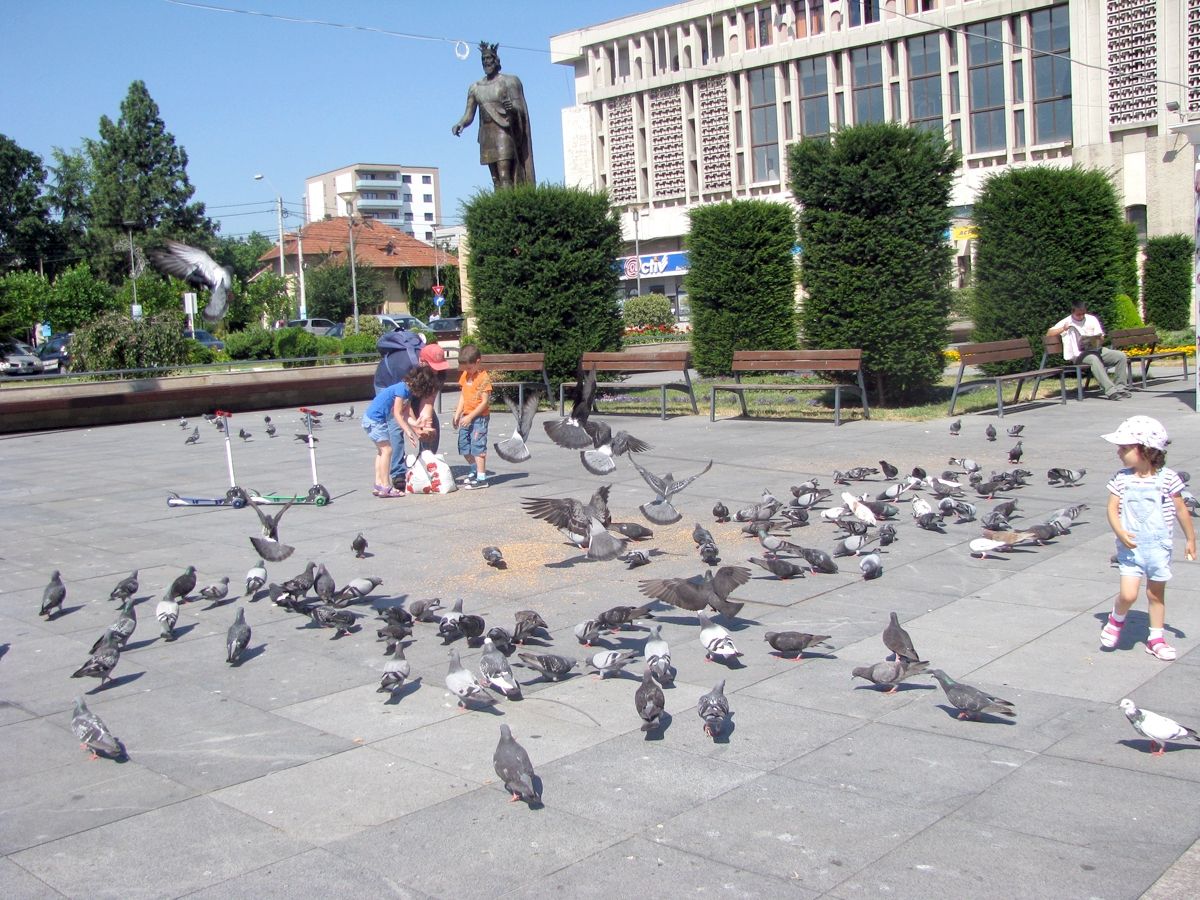 Într-o aripă a piaţetei Primăriei Piteşti, zeci de porumbei ciugulesc prânzul servit de tatăl care rupe de la gura familiei pentru a îndestula păsăretul urban. Ucenicii bunului samaritean sunt gemenii de-o şchioapă care-l iau pe părinte drept model. Cu mâinile lor mici, prichindeii aruncă în evantaie de veselie grăunţe de grâu, iar zburătoarele aterizează pe platou, gângurind pe lângă picioarele lor cu voioşie. Plină cu cereale, sacoşa de rafie adusă de păsărarul-şef cântăreşte mai bine de 20 kg. În câteva clipe paporniţa se goleşte pe jumătate, fiindcă şi alţi copii intră în joaca serioasă, numită hrănitul porumbeilor.