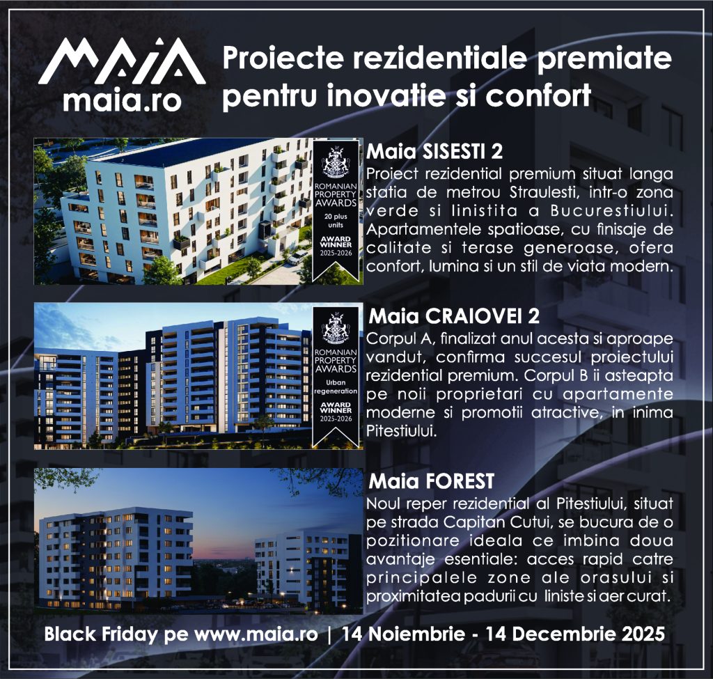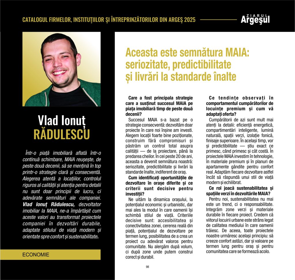 Într-o piață imobiliară aflată într-o continuă schimbare, MAIA reușește, de peste două decenii, să se mențină în top printr-o strategie clară și consecventă. Alegerea atentă a locațiilor, controlul riguros al calității și atenția pentru detalii nu sunt doar principii de lucru, ci adevărate semnături ale companiei. Vlad Ionuț Rădulescu, dezvoltator imobiliar la MAIA, ne-a împărtășit cum aceste valori au transformat proiectele companiei în dezvoltări durabile, adaptate stilului de viață modern și orientate spre confort și sustenabilitate.